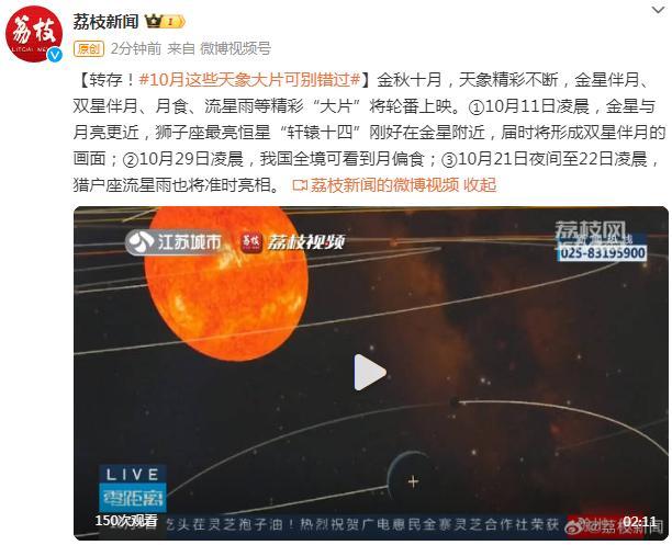 金秋十月,天象精彩不断,金星伴月、双星伴月、月食、流星雨等精彩“大片”将轮番上映。①10月11日凌晨,金星与月亮更近,狮子座最亮恒星“轩辕十四”刚好在金星附近,届时将形成双星伴月的画面;②10月29日凌晨,我国全境可看到月偏食;③10月21日夜间至22日凌晨,猎户座流星雨也将准时亮相。