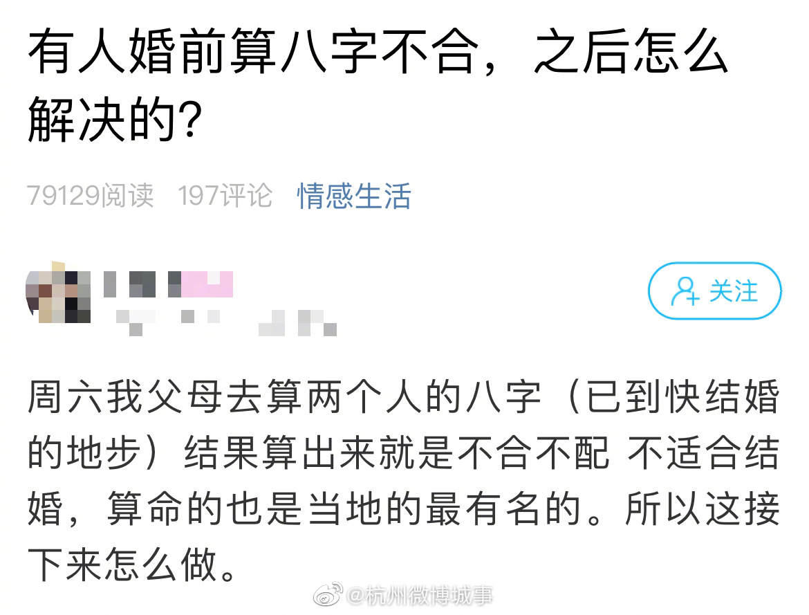 #宁波周边事# 【#网友婚前八字算出来不合# ,这该怎么解决?】近日杭州一网友发帖称:结婚前父母拿着两人的八字去算命,结论是两人不合不配,不适合结婚,因为算命先生是当地最有名的一个,为此网友感到困惑,不知道接下来怎么办?[并不简单]帖子一出,引发网友热议,一网友更是表示:换个算命先生,换到合了为止。[笑cry]