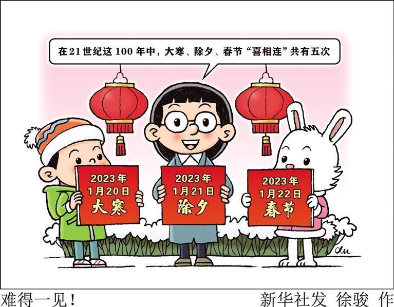据统计,21世纪这100年中,大寒、除夕、春节“喜相连”共有五次,分别为2012年、2023年、2042年、2061年和2080年,这是中国传统历法遵循日月运行规律而形成的结果,个别年份甚至还会出现大寒与除夕同在一天的情形,如2004年和2099年。