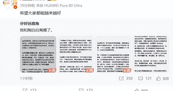 8月6日,知名星座博主陶白白的妻子发布长文称两人两年前已和平离婚,表示“我们会是一辈子的家人,是伙伴,是挚友,是陶酥的妈妈,爸爸。共同去承担我们应尽的义务,让陶酥在更好的环境中成长。”随后陶白白转发微博并配文:希望大家都能越来越好。
