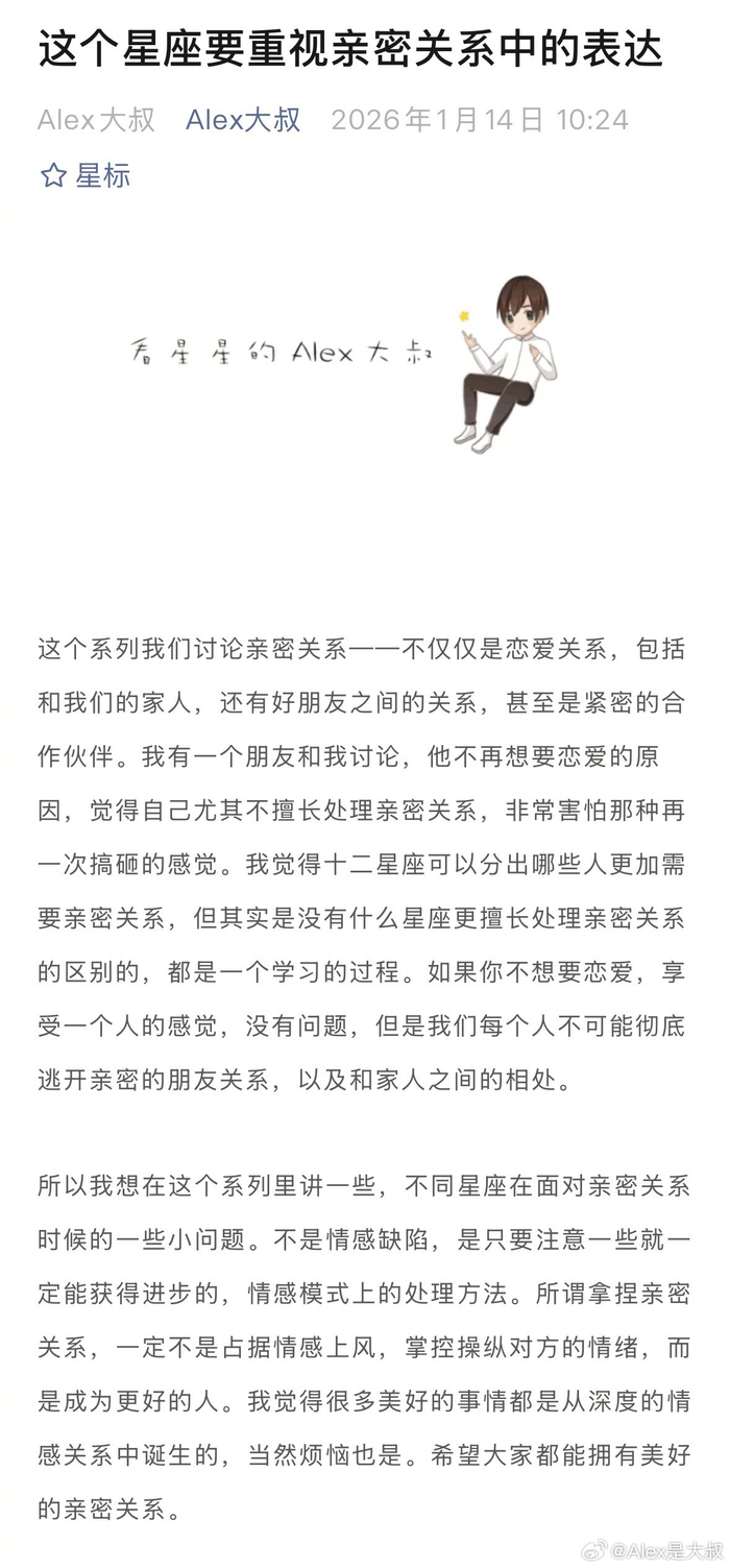 #好运2026# 这个系列我们讨论亲密关系——不仅仅是恋爱关系,包括和我们的家人,还有好朋友之间的关系,甚至是紧密的合作伙伴。我有一个朋友和我讨论,他不再想要恋爱的原因,觉得自己尤其不擅长处理亲密关系,非常害怕那种再一次搞砸的感觉。我觉得十二星座可以分出哪些人更加需要亲密关系,但其实是没有什么星座更擅长处理亲密关系的区别的,都是一个学习的过程。如果你不想要恋爱,享受一个人的感觉,没有问题,但是我们每个人不可能彻底逃开亲密的朋友关系,以及和家人之间的相处。