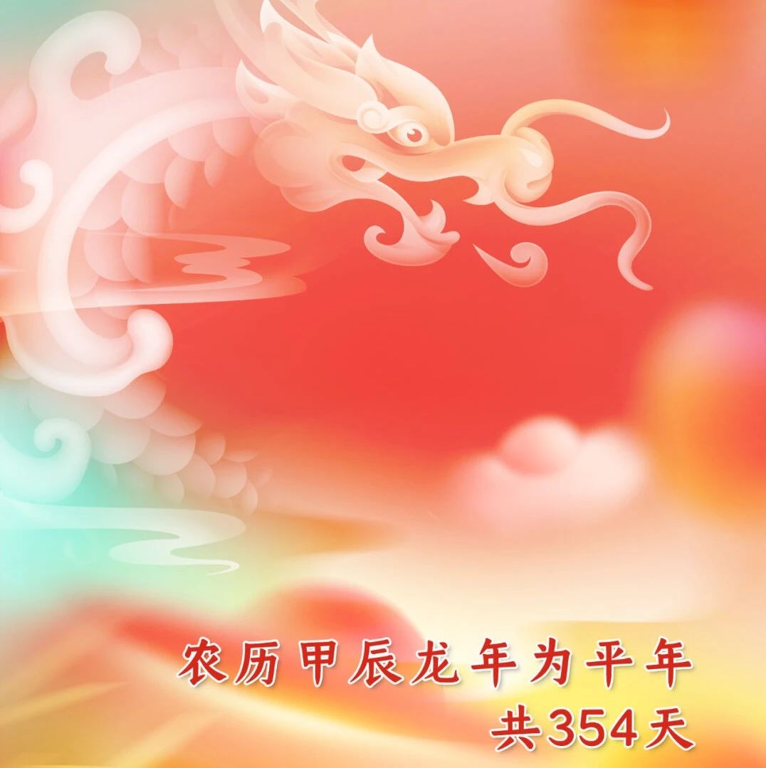 2月10日,农历甲辰龙年开启,这个龙年共有354天,比刚刚过去的农历癸卯兔年少了30天。