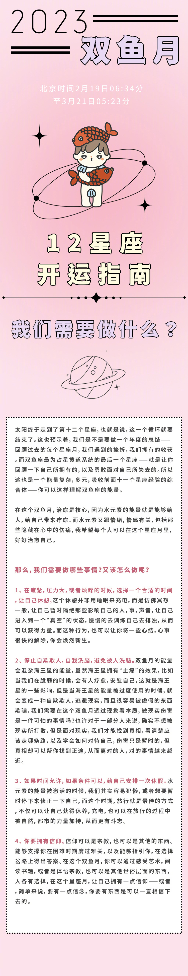#恋爱星引力# 太阳终于走到了第十二个星座,也就是说,这一个循环就要结束了。这也预示着,我们是不是要做一个年度的总结——回顾过去的每个星座月,我们遇到的挫折,我们拥有的收获。而双鱼座最为占星黄道系统的最后一个星座——就是让你回顾一下自己所拥有的,以及勇敢面对自己所失去的。所以这也是一个能量复杂,多元,吸收前面十一个星座经验的综合体——你可以这样理解双鱼座的能量。