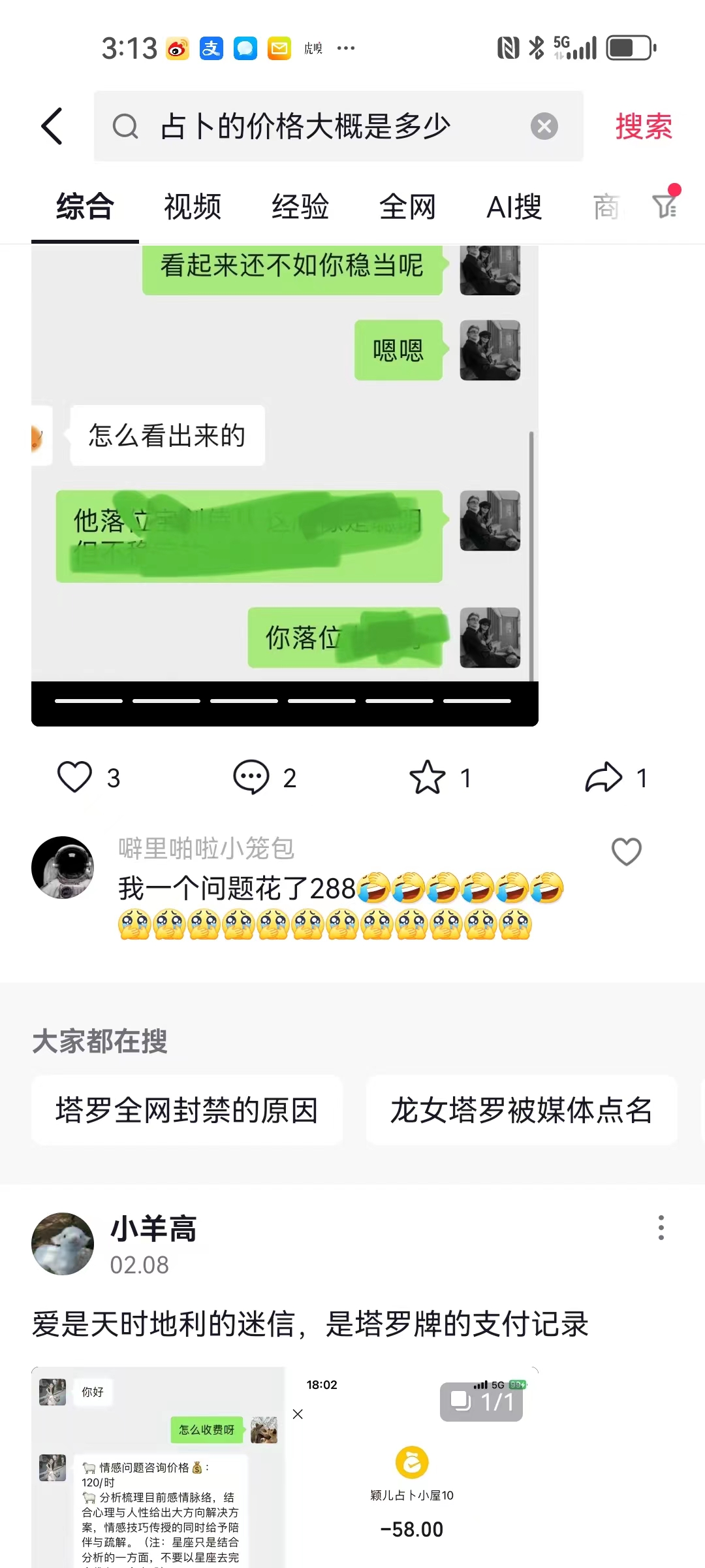 网友“噼里啪啦小笼包”问了占卜师一个问题就花掉了288元。而网友“知朔”为了和女友复合,不惜打给了“大师”1500元,然而得到的结果仍然是“她不爱你”。