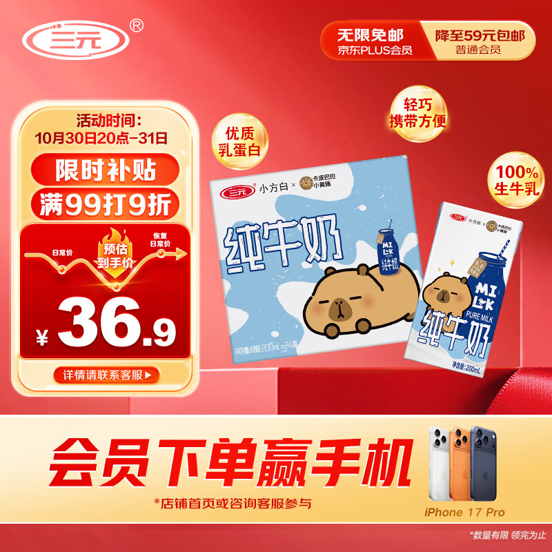 三元小方白纯牛奶200ml*24盒 100%生牛乳