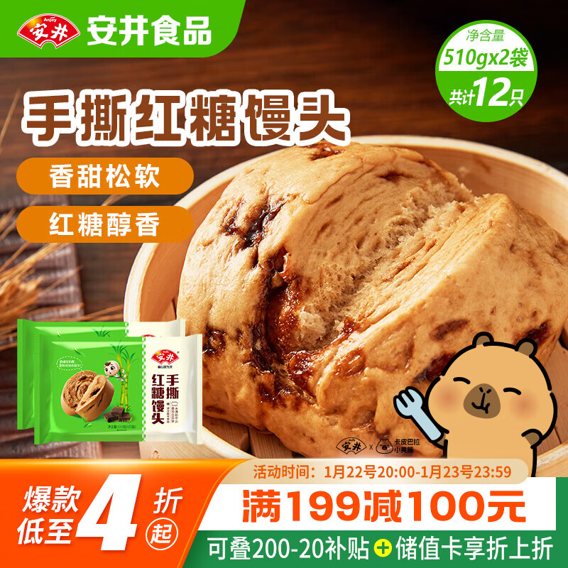 安井手撕红糖馒头 510g*2袋 12个 家庭装面点馒头包子 速冻早餐半成品