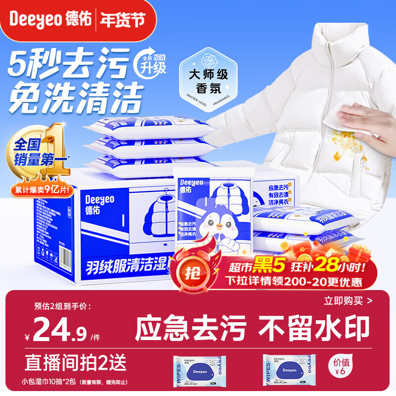 德佑羽绒服清洁湿巾10抽*8包 免洗去污渍湿纸巾干洗剂便携小包装