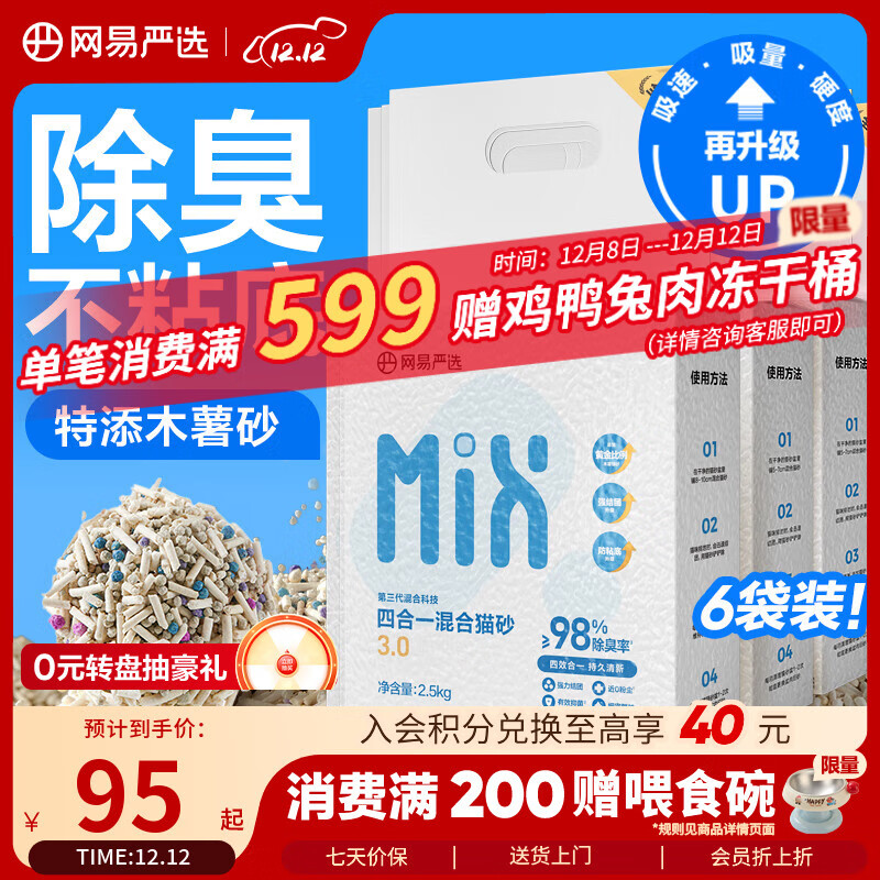 网易严选四合一豆腐膨润土植物混合猫砂结团不沾底除臭木薯猫砂 2.5kg*6包