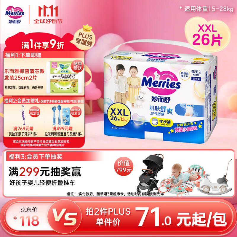花王妙而舒拉拉裤XXL26片(15-28kg)加加大号尿不湿弹力腰围安心锁水