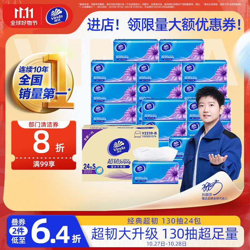 维达(Vinda)抽纸【孙颖莎推荐】超韧3层130抽*24包S码 纸巾卫生纸 餐巾纸整箱