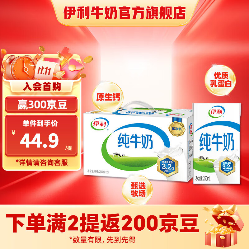 伊利纯牛奶250ml*21盒/箱 全脂牛奶 优质乳蛋白 礼盒装