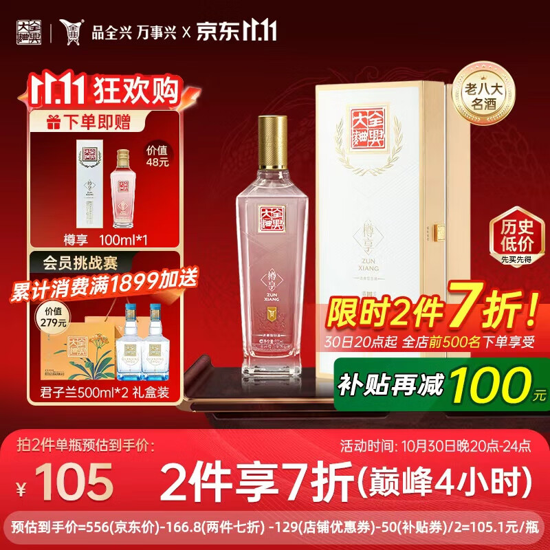 全兴大曲 【老八大名酒】樽享 52度浓香型纯粮酿造高度白酒 500ml 单瓶装