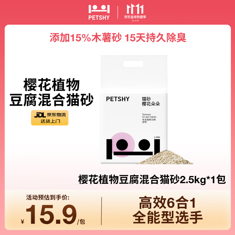 petshy百宠千爱 木薯豆腐混合猫砂六合一植物除臭低尘2.5kg自营樱花猫砂