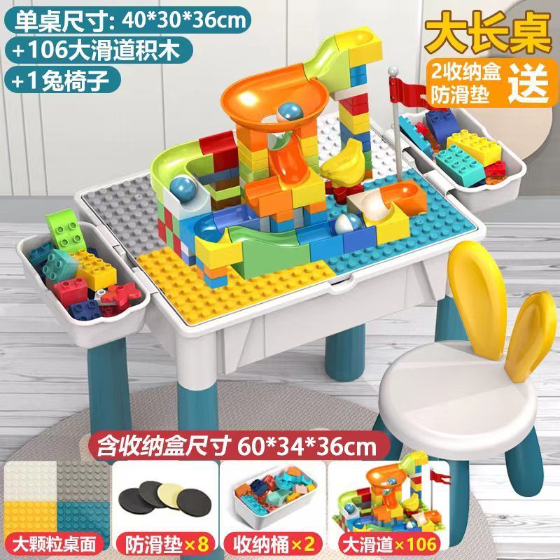 ONEVAN儿童多功能大颗粒积木桌兼容乐高宝宝拼装大号早教益智游戏桌玩具 60*34桌+2收纳+106滑道积木+兔椅
