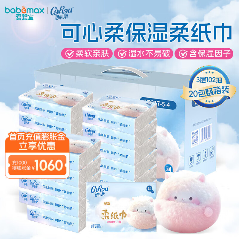 可心柔 (V9 COROU)保湿纸巾乳霜柔纸巾V9三层102抽*20包 婴儿宝宝柔纸面巾 整箱装 可心柔婴儿柔纸巾 3层 102抽*20包