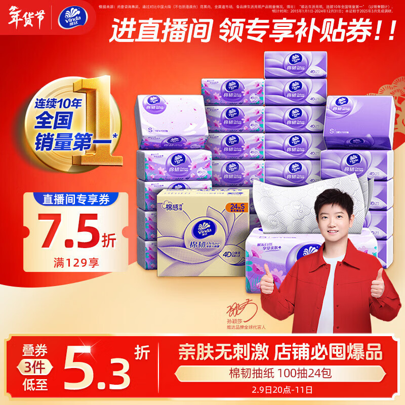 维达(Vinda)抽纸【孙颖莎推荐】棉韧3层100抽*24包S码 亲肤无刺激纸巾 AB混发