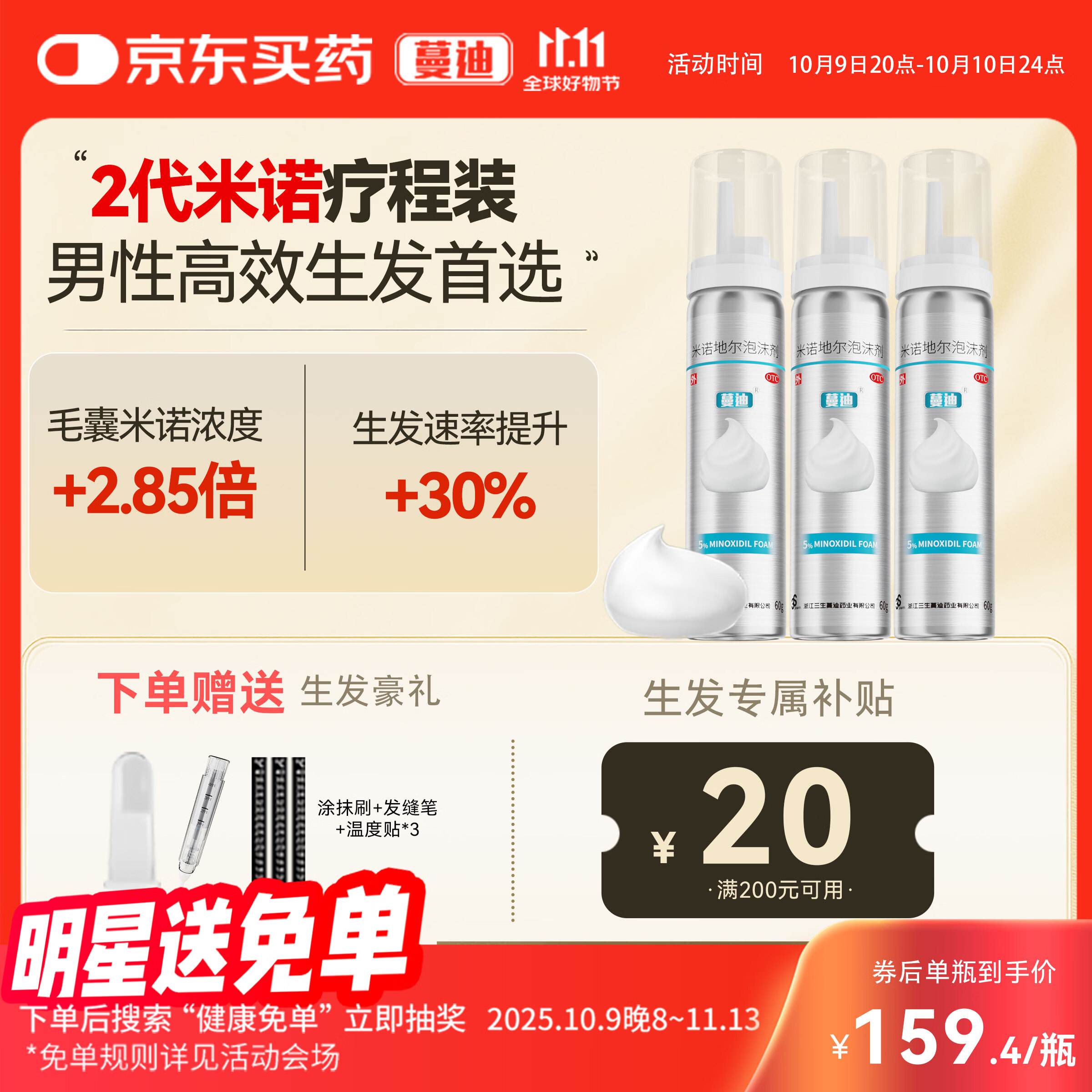 【第二代米诺地尔】蔓迪5%生发泡沫剂60g*3(倍速生发 温和不起痘)男女士专用治脱发防脱育发米洛原液酊搽剂