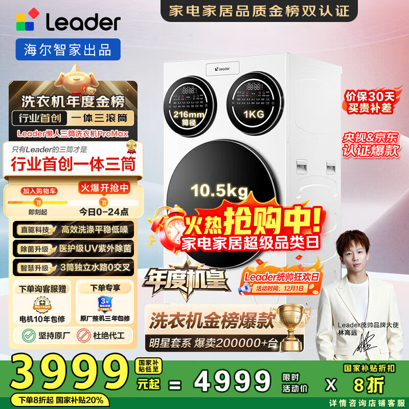 统帅(Leader)海尔智家懒人三筒洗衣机ProMax 12.5公斤 内衣洗 国家补贴XQGL125-MBLDE697WU三桶机皇 林高远同款