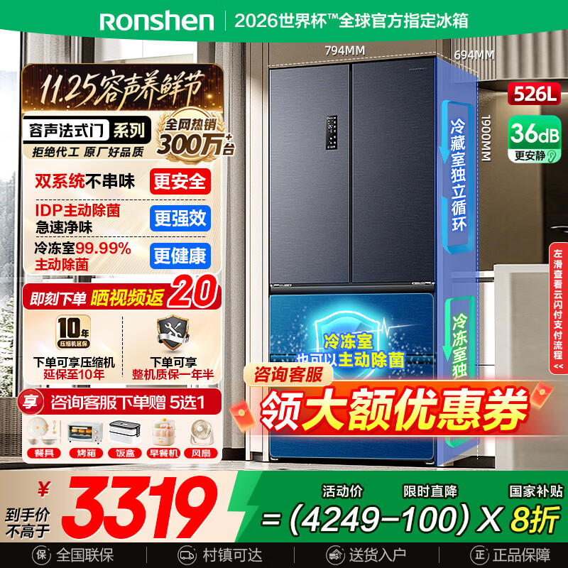 容声526升双净双系统法式多门四开门电冰箱家用一级能效风冷无霜节能大容量BCD-526WD1MPA灰国家补贴 526L冷藏冷冻双净化