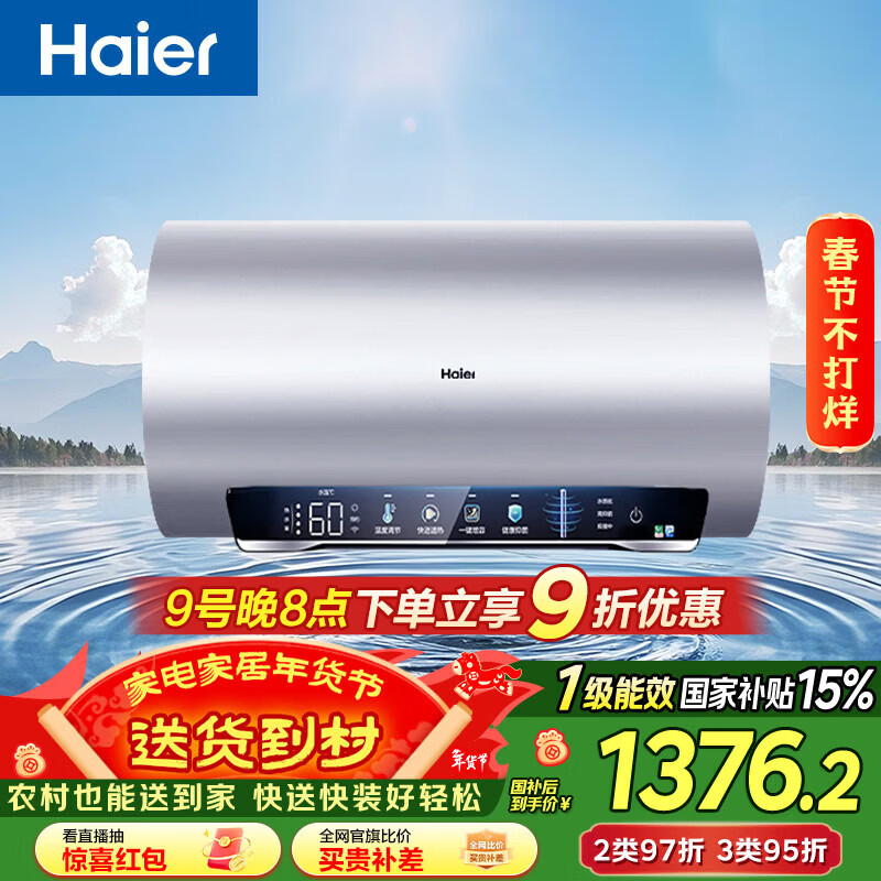 海尔(Haier)国家补贴电热水器60升 小红花JH7 无垢鲜活水净肤洗 免清洗 3300W变频速热一级能效 家用储水式
