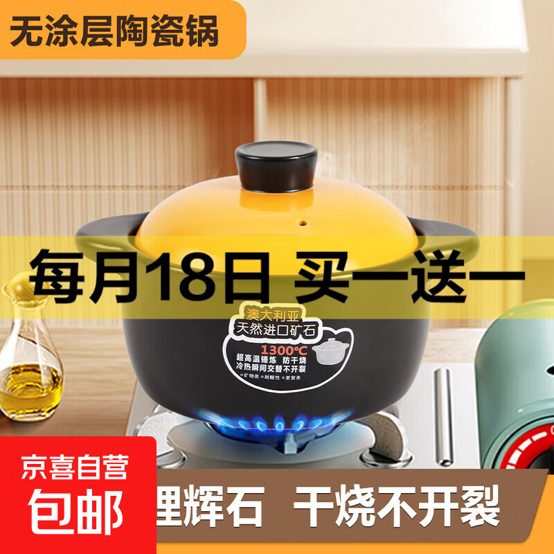 康巴赫同厂砂锅煲仔饭小炖锅耐高温不开裂燃气灶陶瓷锅汤锅 黑锅橙盖 1.6L