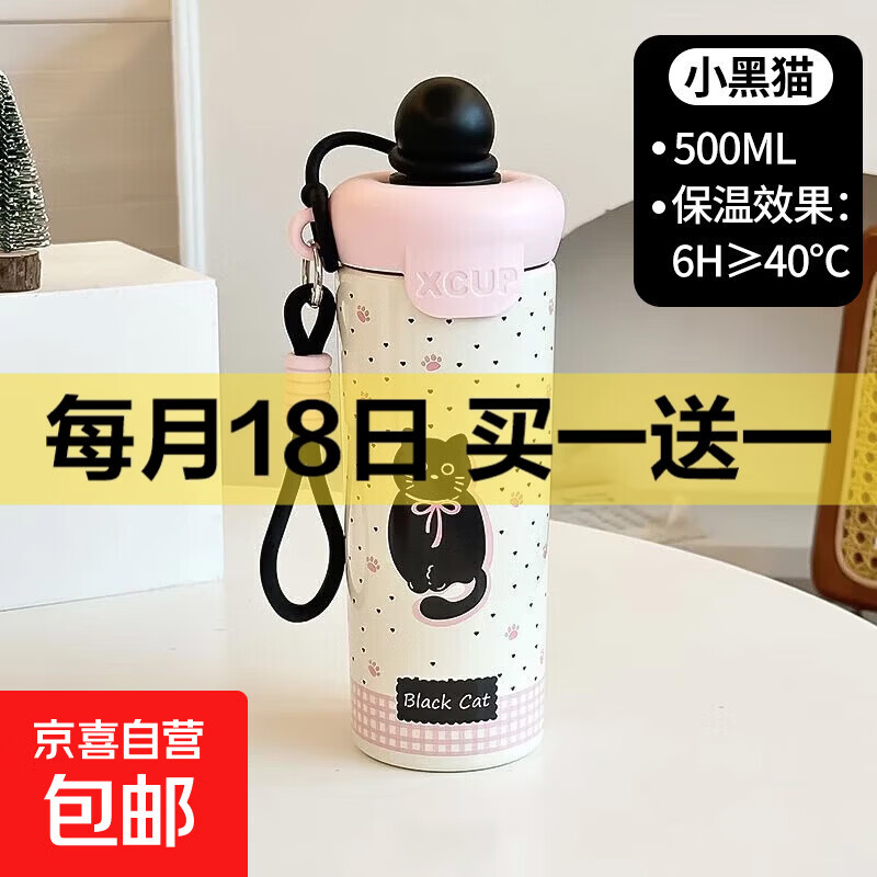 【爆】304浮球保温杯大容量吊带咖啡杯卡通创意学生水杯便携杯子 小黑猫-500ML