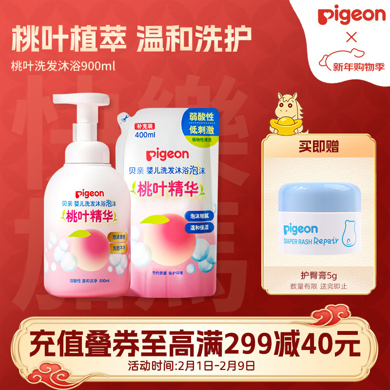 贝亲洗发沐浴二合一 儿童沐浴露 婴儿沐浴露洗发水二合一 桃叶精华 洗发沐浴泡沫促销装900ml