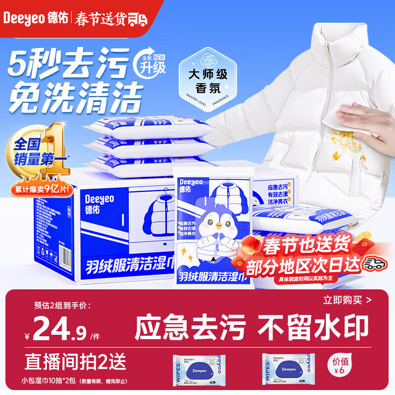 德佑羽绒服清洁湿巾10抽*8包 免洗去污渍湿纸巾干洗剂便携小包装