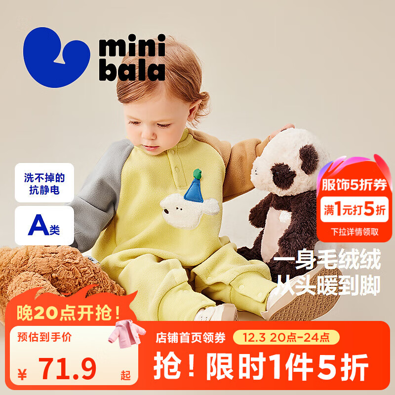 minibala巴拉【抗静电】婴幼儿连体衣摇粒绒可外穿插肩袖宝宝衣服2025新款 蜜糖黄31214 90cm