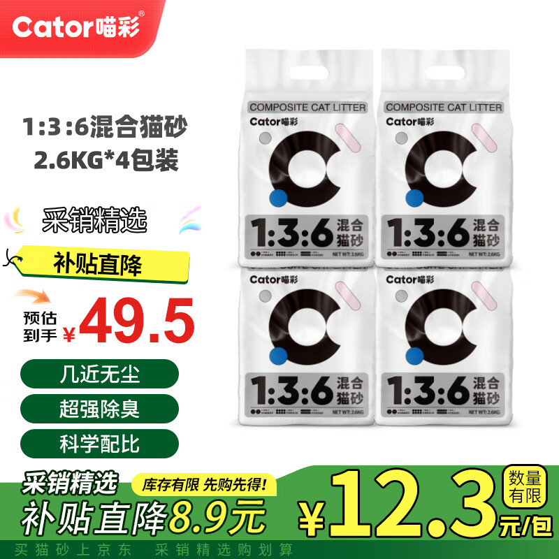 喵彩除臭豆腐膨润土混合猫砂低尘不粘底 2.6kg*4包