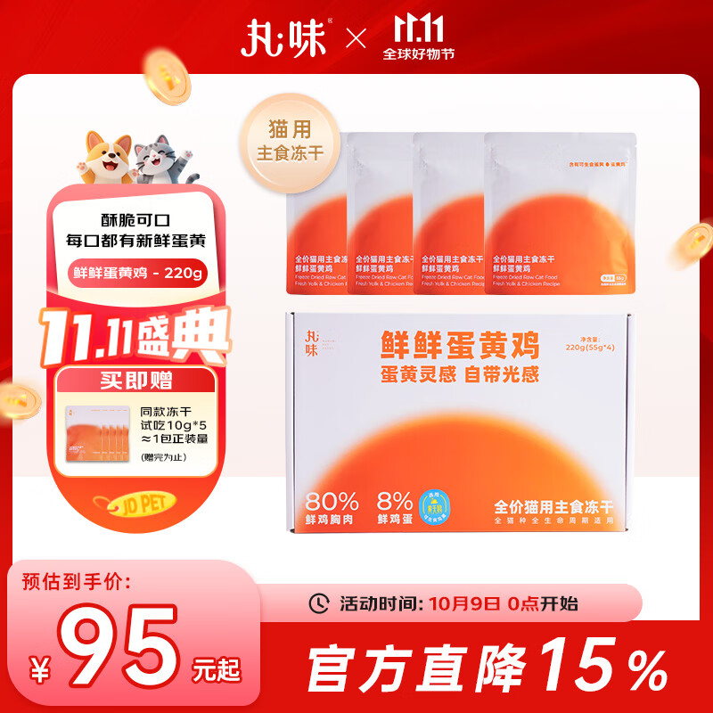 丸味鲜鲜蛋黄鸡猫主食冻干猫粮泰森鲜鸡添加蛋黄适口性好55g*4包*1盒