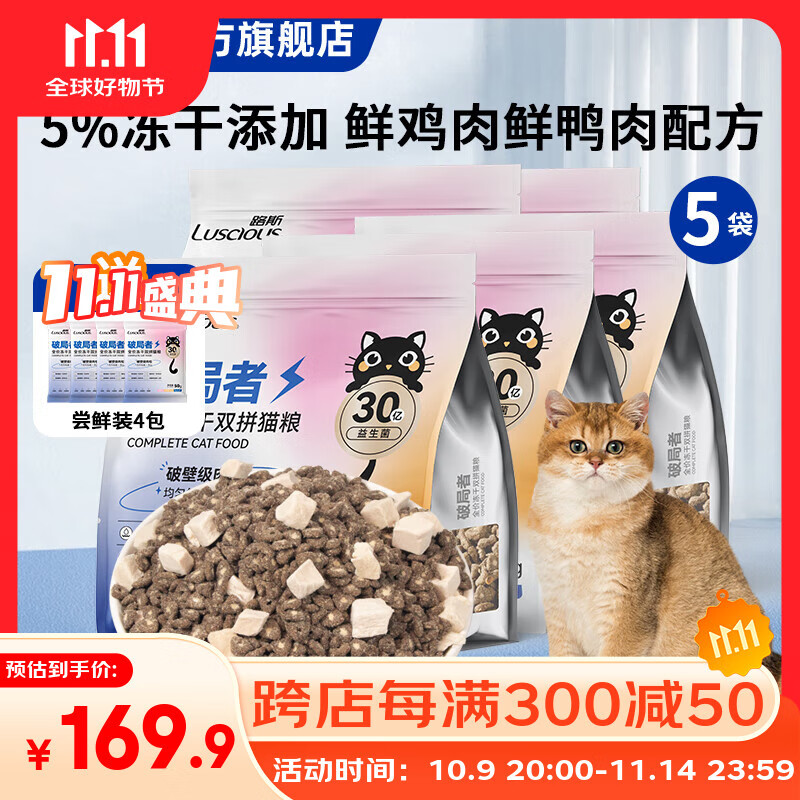 路斯猫粮肉松夹心双拼鲜肉无谷猫干粮全期冻干猫粮 破局者系列 【鸡&鸭】夹心冻干猫粮2kg*5袋