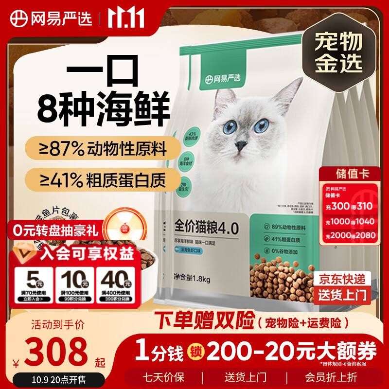 网易严选全价猫粮4.0成幼猫三文鱼亮毛养胃深海鱼虾1.8kg*4袋【宠物金选】
