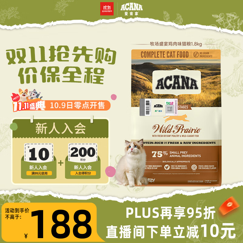 愛肯拿(ACANA)猫粮 牧场盛宴成猫幼猫粮 高蛋白无谷进口鸡肉粮1.8kg效期26/7