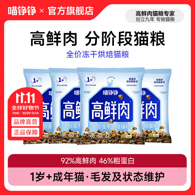 喵铮铮【试吃3送1】高鲜肉烘焙粮冻干猫粮宠物成幼猫全价营养增肥猫干粮 【鲜兔排50g*3】送1包|共4包 50g*3(到手50g*4包)