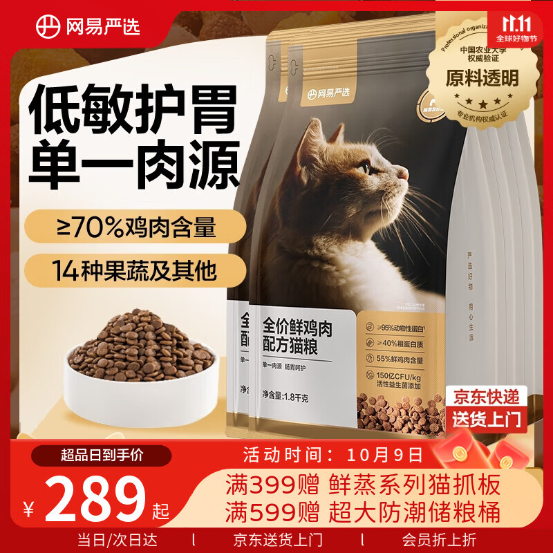 网易严选全价鲜鸡肉猫粮 成幼猫粮单一肉源无谷益生菌低敏护肠胃增肌7.2kg